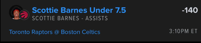 Barnes is under this line in 42% of games this season. Today he faces the Celtics who allow the 4th least assist to SF this year. Against boston he is under this line every time he has faced them averaging just 3.9 Ast per game. Another key reason I like this play is RJ Barrett is out due to illness and without RJ he is under this line in all 5 games having 4,4,6,6,5 with an average of 10.4 Potential Ast per game during that stretch without Barrett.There is also blowout potential here Celtics being favored by 17 and just coming off of a bad loss at home to the Pacers. They will be looking to get back on track today at home. I see Barnes staying under this line once again against a top 5 defense against Small Forwards.